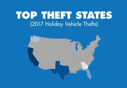 California was the number one state with the most holiday vehicle thefts in 2017 with 5,142. It was followed by, in descending order, Texas (1,988), Florida (1,396), Washington (819) and Georgia (812).
